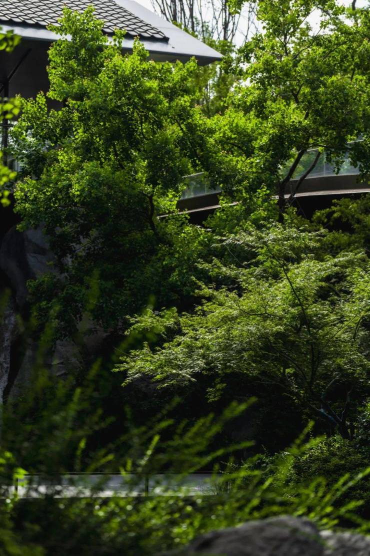 下沉式庭院【三池一山】流水潺潺,草木生机勃勃,青石小路不失为午后散步的好去处。