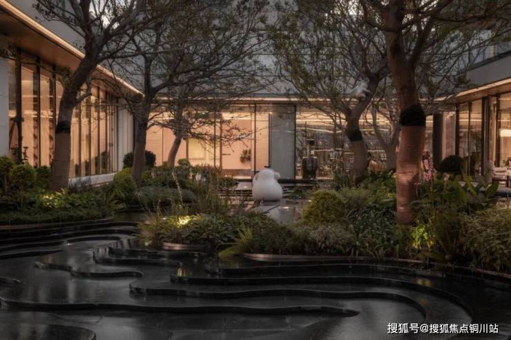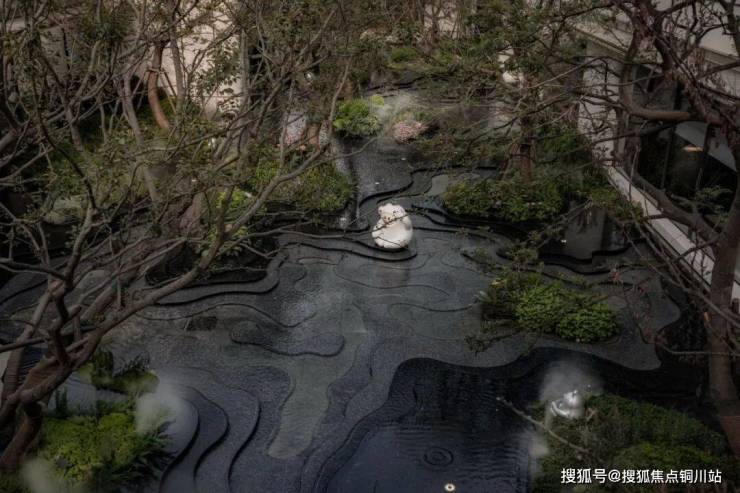 下沉庭院结合四边建筑的进退,形成一方水上森林,与室内空间互为借景,相互交融。行进在室内环廊中犹如徜徉在林溪间,让生活边界更加模糊。
