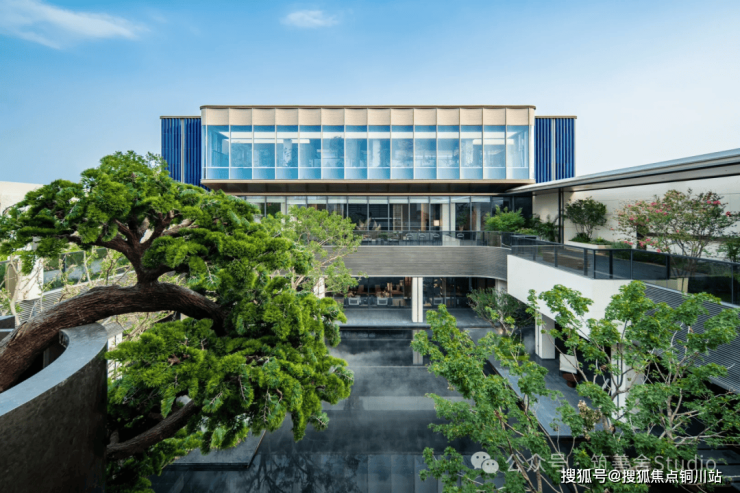 穿越迎宾大门与景墙,映入眼帘的是以水瀑为中心的过渡中庭。碧水潺潺,被古韵十足的苍松环抱,其中两块巨石之上,瀑布如丝如练,飞流倾泻。弧形铝板构成的风雨连廊,优雅地伸展至入户大堂。连廊之下,特设观瀑高台,雨天在此小憩,更显悠然意境。