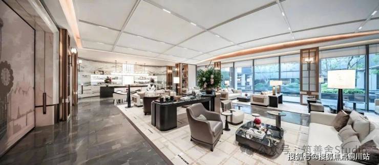 约600平方米的尊贵归家大堂,外立面采用蓝色陶瓷棍拼接,塑造出一幅“千帆竞发”的艺术墙面。踏入其中,迎面而来的是采用巴基斯坦青玉打造的豪华背景墙,彰显着尊荣与热情的欢迎之意。背后是休闲会客厅(目前作为沙盘展示区),便于接待来宾或与邻里间轻松交谈。相邻的品牌馆未来将规划为快递收取区,为您提供更为便捷的收取服务。
