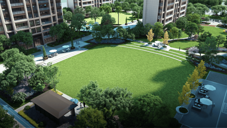 项目打造约 9000 平 “苏梅岛” 度假酒店风中轴景观园林,将度假酒店的闲适氛围融入社区景观之中。园林由专业团队精心雕琢,以中央景观区为核心,设置戏水池、森氧会客厅、阳光草坪及儿童活动区等丰富功能区域 。戏水池周边布置度假风情休憩座椅,仿佛漂浮岛屿,为业主提供惬意的休闲放松空间;阳光大草坪作为社区弹性活动场域,可满足露营、瑜伽、音乐会等多元场景需求,让业主尽情享受户外生活乐趣 。园林设计融入江南水乡文化元素,提取市花 “梅花” 及锡绣元素,将其巧妙运用在景墙格栅及入口铺装等细节之处,展现独特江南海派韵味,营造出兼具艺术性与领域感的社区景观 。