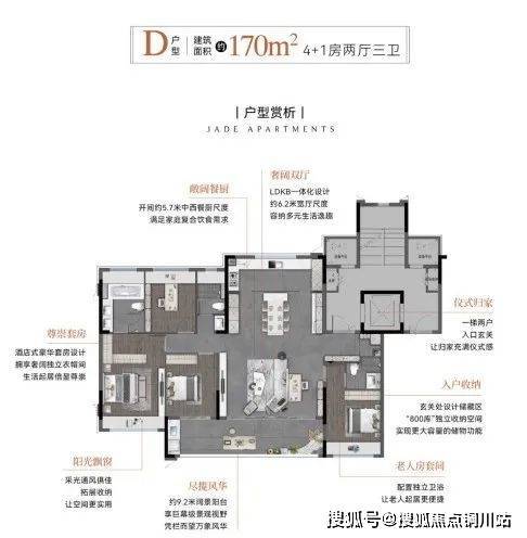 170㎡的洋房做了4+1房,南阳台面宽达到了约9.2米,3个卫生间,不过有一个暗卫。
