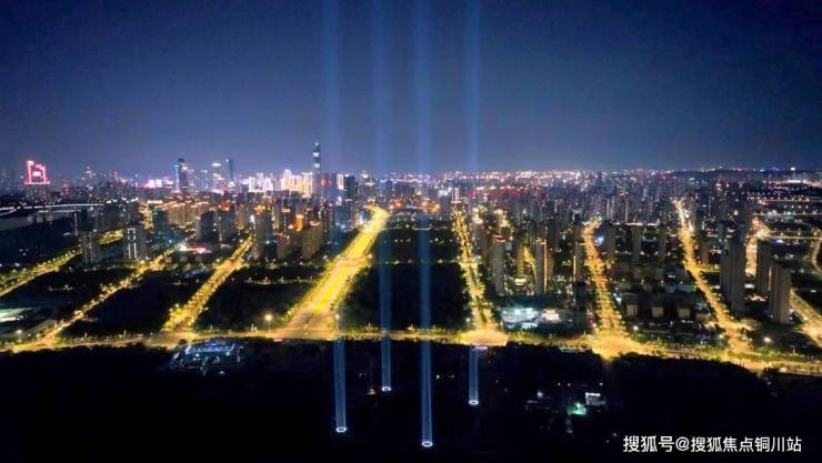 去年7月,鱼嘴500米高楼工地,216束光束,光芒四射: