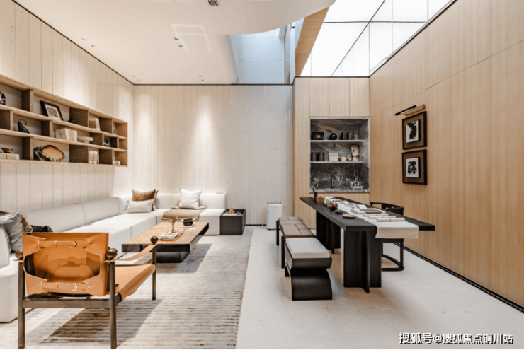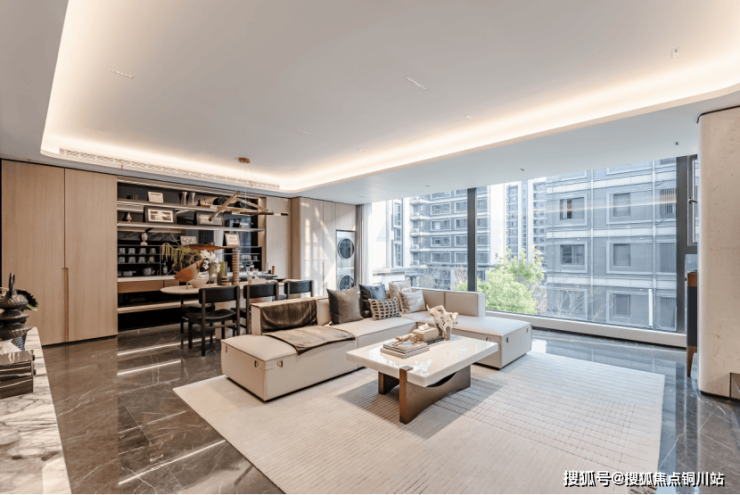 六开间朝南的大胆创新格局,超尺度的玻璃覆盖面,让单层采光面高达约10.6米,客厅开间约7.3米,空间尺度上远超普通别墅,室内就像是光影艺术馆。