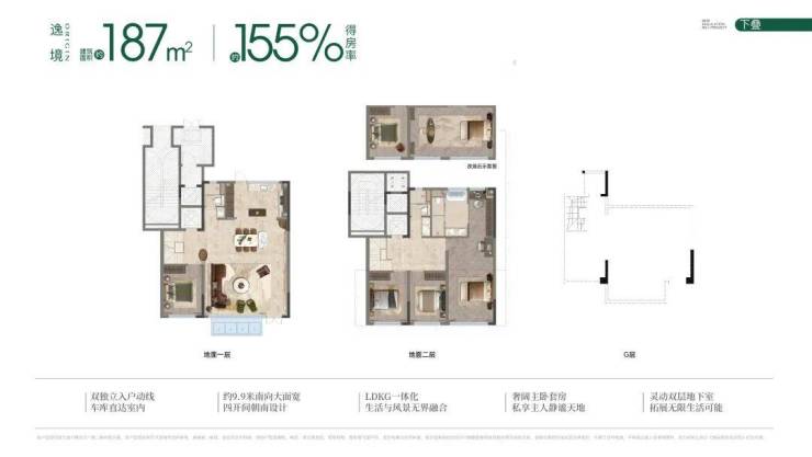项目规划为4F真叠墅,分为上、下叠产品。通过摒弃中叠设计和抬高地坪,上叠配备超大星空露台与空中花园,下叠拥有超大庭院和露台,抬高后下叠地下室=普通别墅的一层!