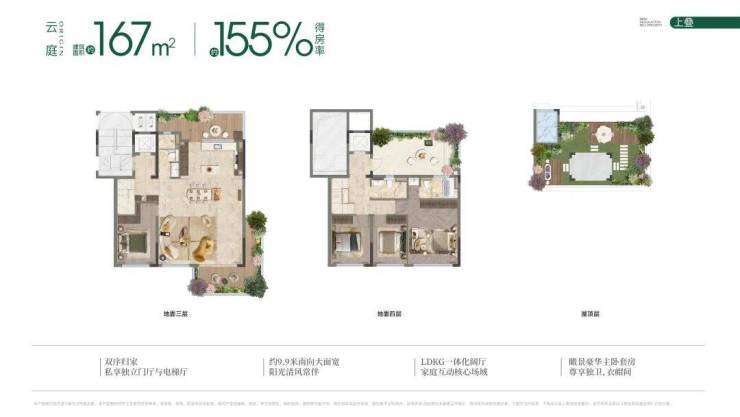 其亮点在于通过挑空、露台等设计,创造了总计约60㎡的五大露台花园,综合使用率高达约155%,其实际可使用的空间体感可媲美常规约260㎡的户型。