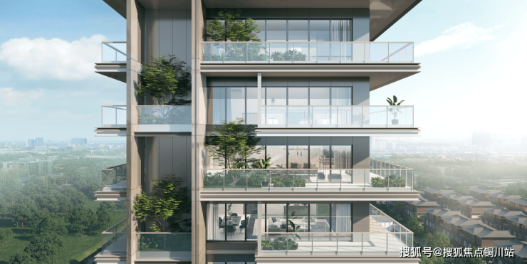建筑设计:高层建筑革新传统,外立面采用香槟色线条勾勒,辅以石材 + 铝板干挂工艺,沿河大平层阳台覆土种植立体绿植,打造 “第四代住宅”。配套用房屋顶更精心覆盖草坪式绿化,提升人居品质。