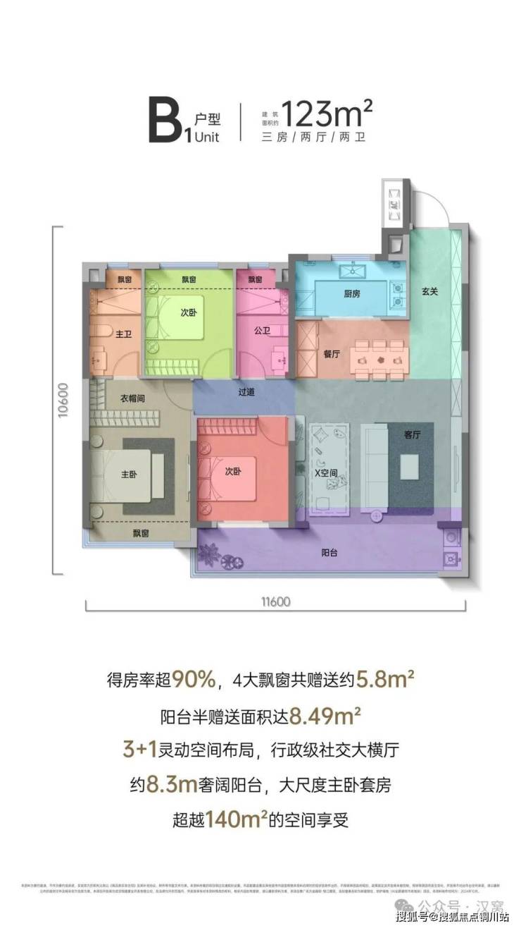 125户型3+1灵动户型设计,南向约8.3米长巨幕阳台,90%得房率,