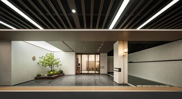比如在大门的两侧,红洞石和米黄石材的巧妙搭配,就营造出自然归家的精致美感。