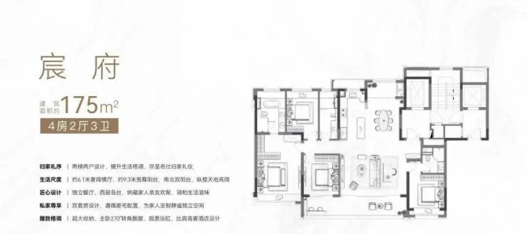 2)从户型角度看,建面约175㎡四房两厅三卫可谓改善王者,整个地块也不到70套,未来也是置换顶端的户型。