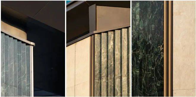 入口空间采用了传统中式建筑的对称布局和挑檐形式,营造了一种尊重感、礼仪感。社区入口的材料选用了百达翡翠,它的灵感来源于Piaget伯爵香港旗舰店的设计,百达翡翠具有石材的纹理和质感,精细的弧形和折线的切割工艺,使社区入口别具一格,展现出一种温文而雅又不失风骨的气质,是一种东方美学与现代美学的完美结合。