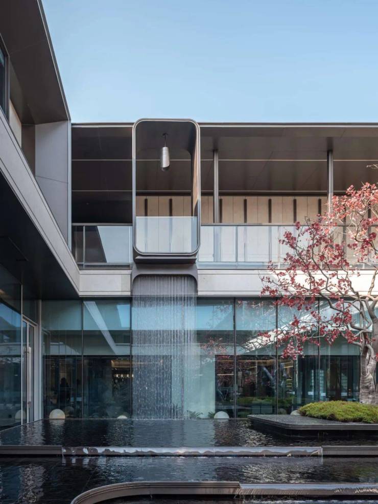 一进院落,叠水与树木形成诗意空间,建筑从后显现,若隐若现。一园一世界,一步又一景,设计师们不仅仅赋予不同下沉庭院主题化,更想通过设计让室内与室外立即融为一体。