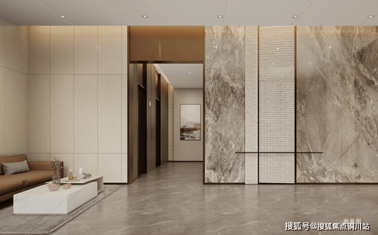 入户公区大面积采用石材+木饰面铺装,连公区过道都采用了造型吊顶,凸显 精致大气的质感, 并且配备了 国际品牌 通力电梯,品质遥遥领先。