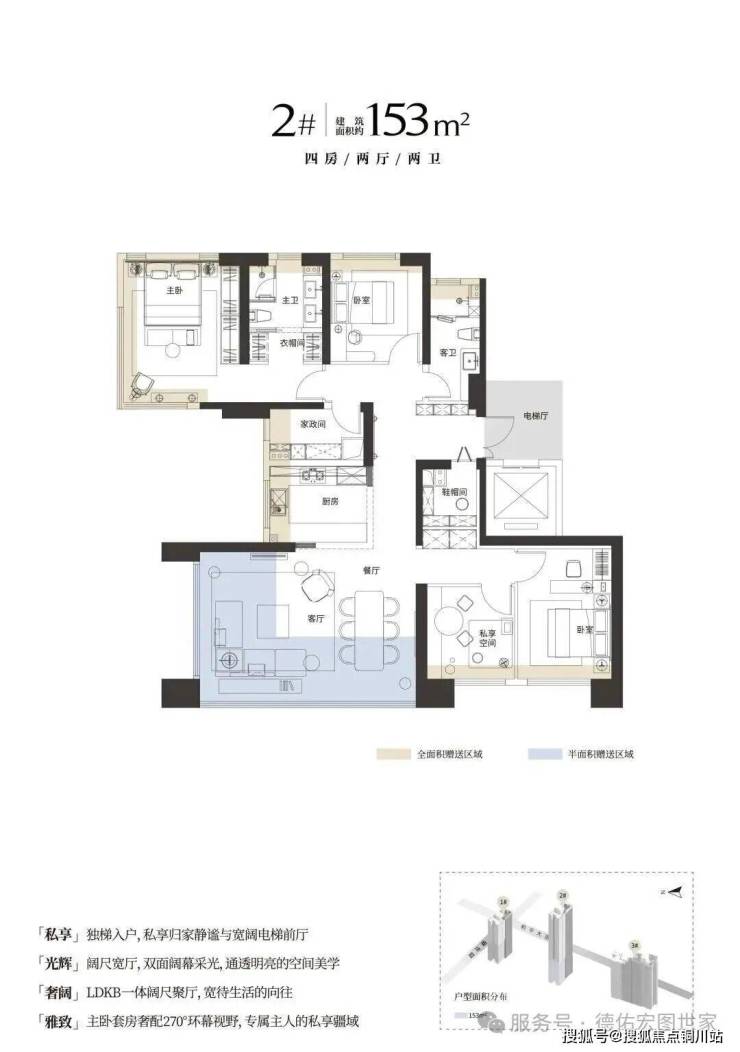 该户型为1号楼16-28层西边户,在153户型基础上增加了西侧家政间和北侧卫生间等面积,高区和低区做成了不一样户型。主卧做到了三面全景落地窗,客厅也有西南向270度的景观视野。该户型是本项目的王炸户型,即可以保证采光,也有不错的江景,但有西晒影响。