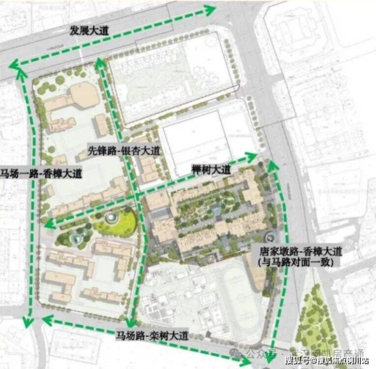 同时规划约300米的高线廊桥公园,不仅能直达会所、街区、体育中心等核心资源,从而融合小区内各功能空间、内外街道等。这个公园还能提升小区景观层次,廊桥上下也能成为不同的互动功能空间。