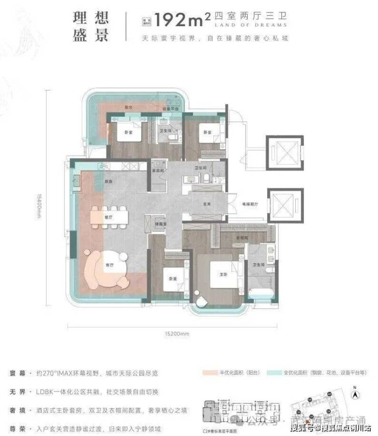 空间尺度上:此户型做到了真正的三面采光,南向约15.2米采光面,采用大量全景落地窗,LDBK一体化动区的转角弧度阳台,不仅空间阔绰,环幕采光视野更是一绝;北向套房被阳台环绕,实现极为霸气的270度视野。