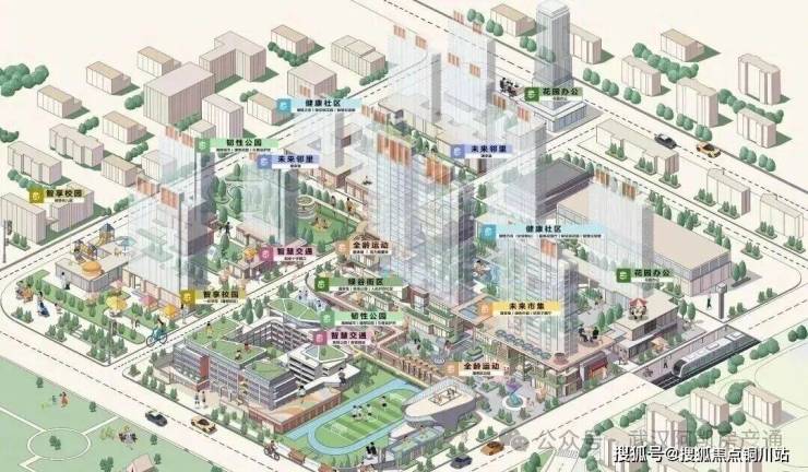 从项目的业态分布示意图可以很明确的看到,小区内规划了非常完善的城市场景,包含绿谷街区、未来市集、全龄运动、智享校园、未来邻里、健康社区、韧性公园、花园办公、智慧交通等。大部分城市服务都能在小区内得到满足。