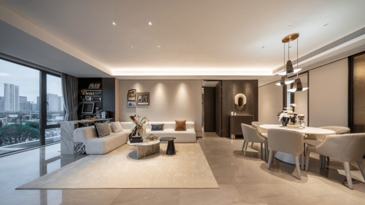 同频世界的极简美学,打造Super Flat超扁平风格;沿袭绿城高端系经典审美,采用系统设计全包阳台,同款苹果旗舰店的全面屏,映照江岸流动的风景;同时,打造慈溪极为罕见的巨幅窗墙比,结合印度蓝石材及香槟金铝线条,于细节之处传达慈溪头部奢宅的贵重气场,让整体效果更加震撼。