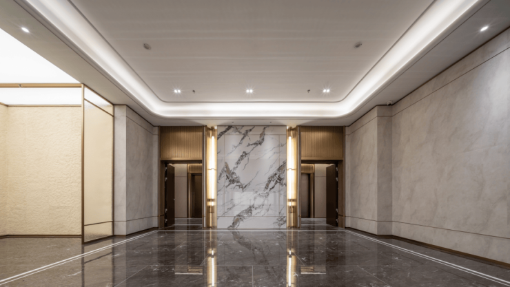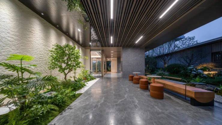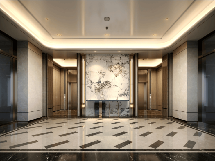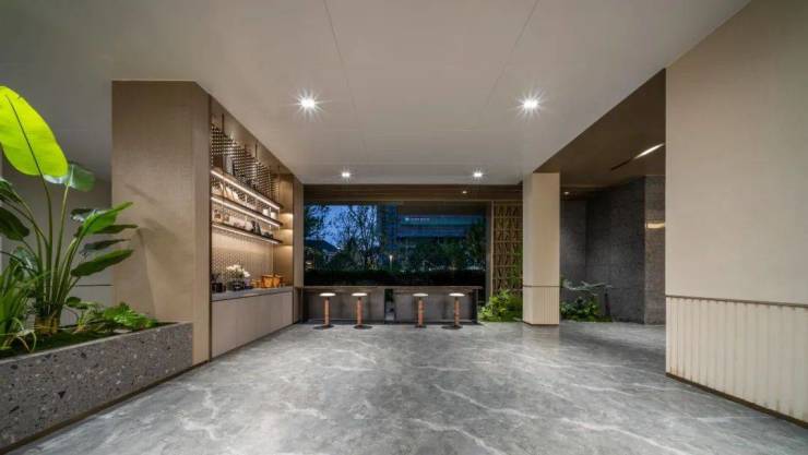 更豪横的是,晓风印翠的地库大堂做的像是地面大堂一样高级,芬迪白岩板作为主背景,墙面采用仿大理石瓷砖,加上景观植物的点缀,整个空间既奢华又温馨。