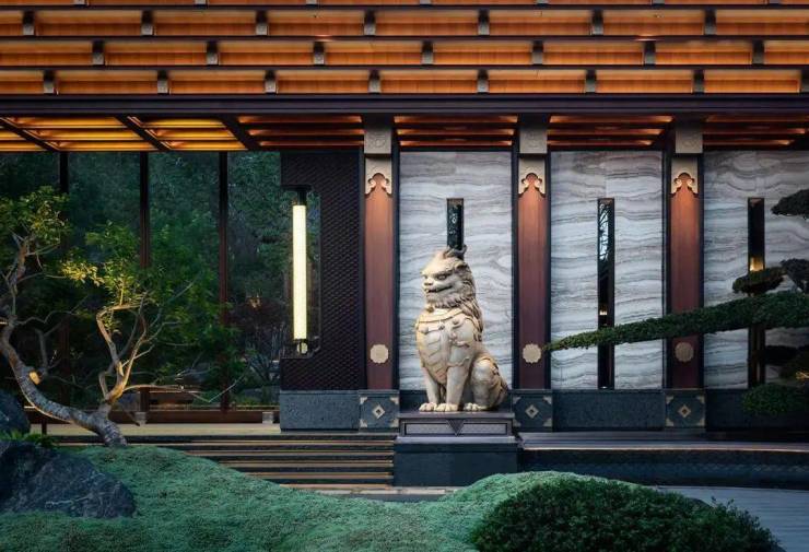 中式豪宅,讲究高门府第,气派大门必不可少。保利天瑞,匠造王府制式大门,大门坡顶屋檐远看有"重峦叠嶂"之感,配上门口点缀着宫廷才有的三出阙宫阙灯柱,造价百万一只的甪端瑞兽镇宅,这就是长沙顶豪的气魄和格局。