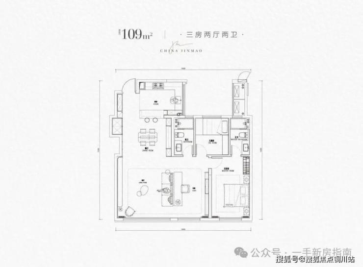 建面约109㎡三房,户型非常方正,南向有约10.9米面宽,还有约7.6米大横厅,据介绍实际得房率有约95.8%。