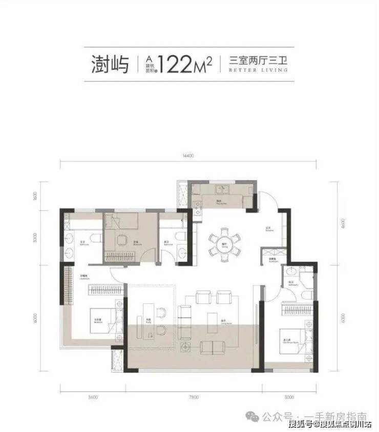 该户型为1号楼西边端头户型,南北通透,3+1房设计,4开间朝南,拥有约14.4米南向面宽,约7.8米大横厅,也是极少数在120㎡+这个面积段就做到三个卫生间的户型。