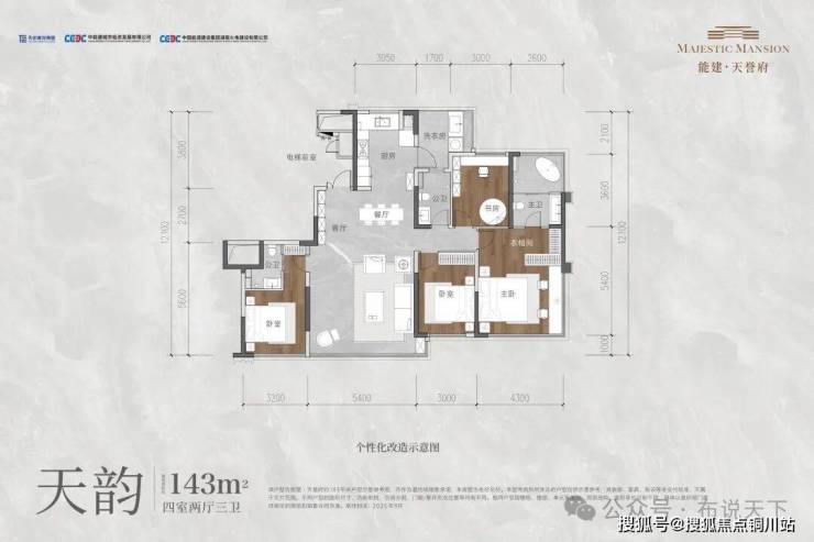 南向双套房,一般是老规大平层才有的配置,能建天誉府建面约143㎡也做到了!