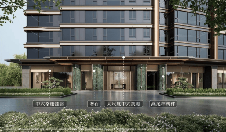 选材上,采用大面积玻璃+铝板+奢石组合,奢华不言自明。奢石主要用于建筑底部的立柱,豪宅质感拉满。造型上,建筑顶部和底部都创新了中式飞檐设计,识别度相当高。如此用心到极致的建筑,不只是城市天际线的一道风景,更是值得引以为豪的家。