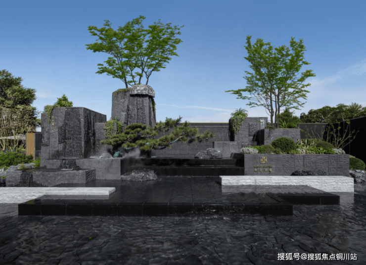 顶部挑檐“莲叶接天”,中间的蓝色水景与绿植,如莲叶浮于碧波,门前广场锃亮的镜面地砖、蓝绿色的中央景墙,模拟“无穷碧”的想象力。