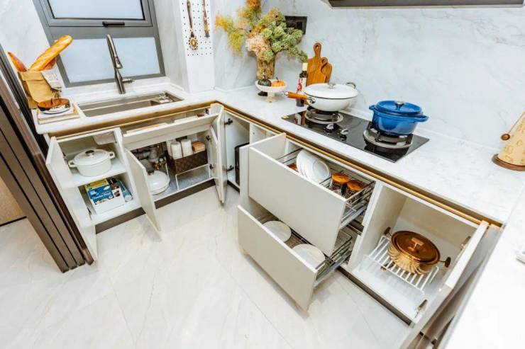 关键是,金茂还很擅长把角落里的鸡肋空间,转化成很顺手的高频收纳。比方在厨房,金茂把最下层的抽屉设计成“踢脚抽”,给高处的柜子设计天使拉篮,水槽边缘加装侧翻抽……「顺手」是什么感觉?就像在厨房里施展魔法一样随心所欲。我们上图照片展示强大的收纳: