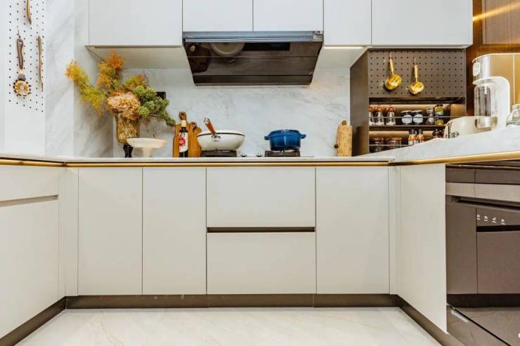金茂重构了厨房结构,让小户型也能拥有岛台、咖啡区,都在你的转身之间。上下橱柜安排的满满当当,还配有洗碗机,甚至他还做了洞洞板收纳!这种提前定制,真的比你自己上网买的,实用还好看!整体看下厨房实景:
