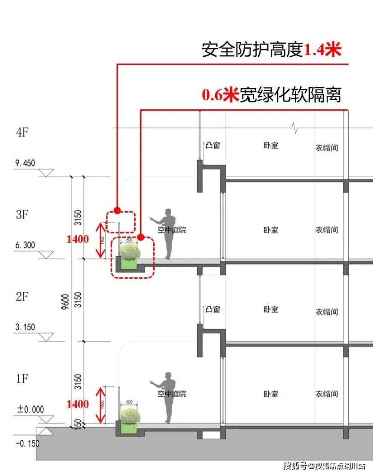 好房子应为居住者提供安全可靠的居住空间。对此,蠡棠森屿针对空中庭院特性实施多重防护:结合空中庭院的使用需求,对庭院周边种植区考虑覆土荷载,对非种植区,按屋顶花园,考虑使用荷载,确保空中庭院的安全稳固可靠;庭院周边融合约1.4m高安全栏杆与约0.6m宽连续绿化带,形成美观有效的物理防护,降低坠落风险。