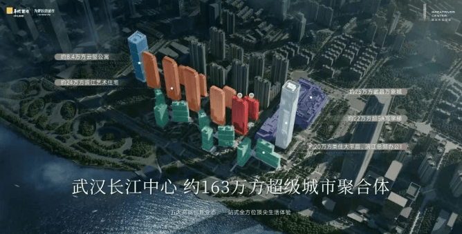 业态分布:包含近 400 米高的写字楼、300 米国际办公塔楼、200 米轻奢办公塔楼、滨江办公群落、25 万平方米购物中心、行政公寓、高端住宅、公园绿地等多种业态。