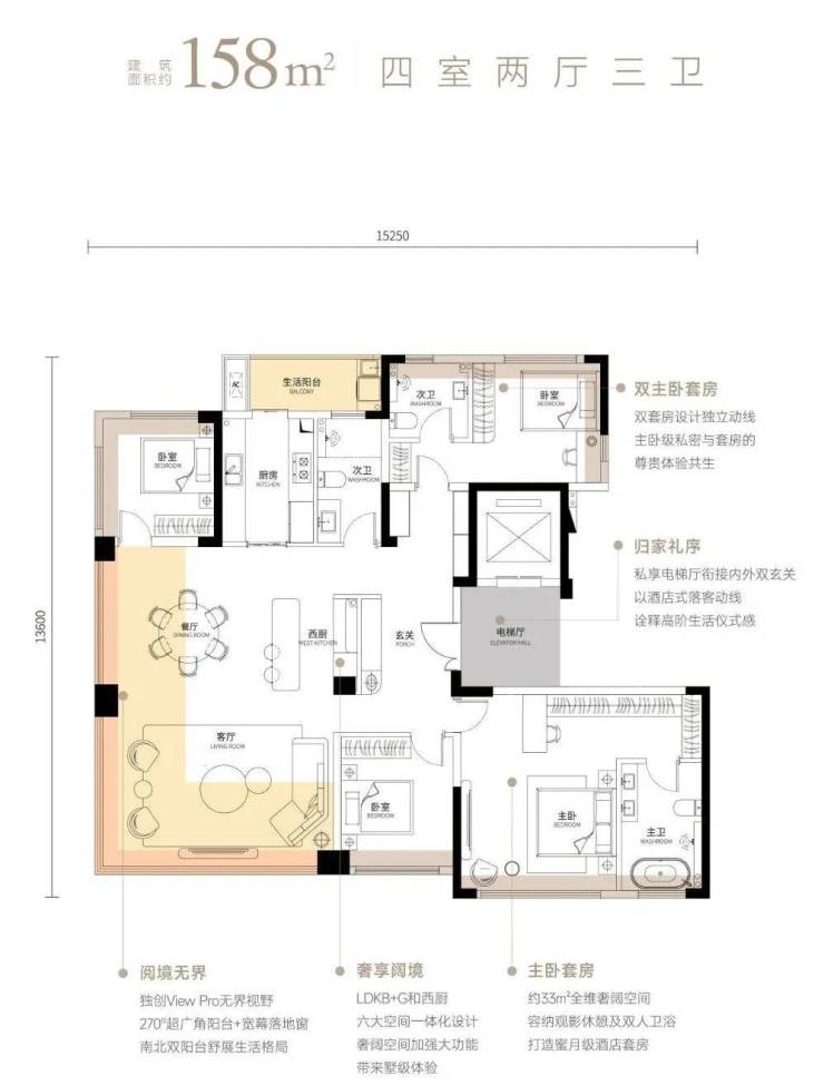 建面约158㎡户型的主卧套房实际空间约达33㎡,这个尺度能够实现当下五星级酒店套房最流行的洄游动线设计。