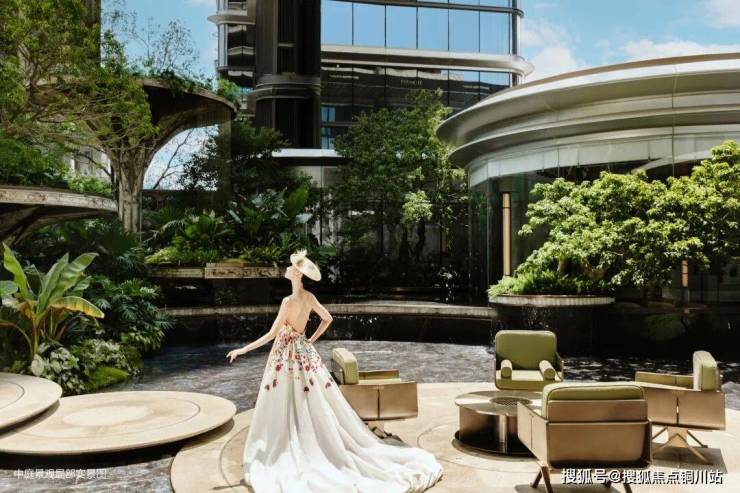 水庭之上,取新加坡滨海湾“擎天树”灵感,三座雕塑式奢石伞形花钵错落绽放。每把伞由1150余片“金孔雀”奢石精密拼接而成,华贵的透光奢石,750米长铜条镶嵌,勾勒出羽毛般的细腻脉络,在阳光下折射出“金羽沐水,鎏羽映波”的流动光泽。