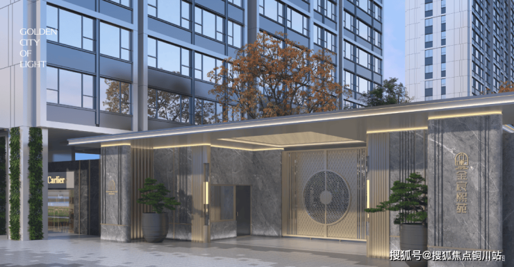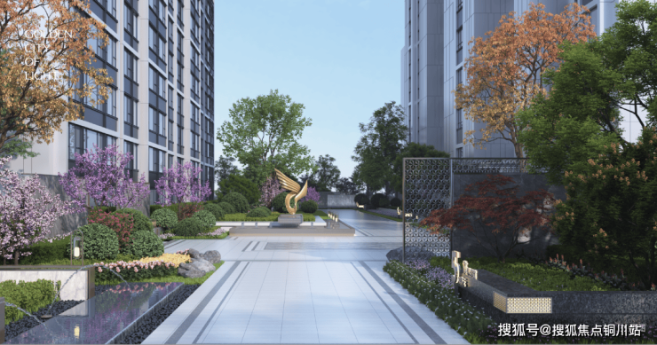 金宸熙苑不仅在建筑立面上提取南京城墙为设计来源,融合铝板线条质感,深灰色、灰色的立面色彩,与古为新的颜值正好呼应古城墙。还将独属于南京的文化符号落位于景观之中。棱镜花格大门、「美人梅、红枫」等花木、「有凤来仪」艺术雕塑、「金陵折扇之形」会客亭廊、「秦淮水韵」的伴水归家水景等元素充分嵌置的园境,彰显南京印迹同时,无界链接千年的南京历史文脉。