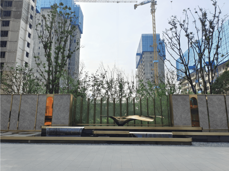 进入大门,首先映入眼帘的就是两侧的涌泉和正对面的“跌瀑”,简单的背景加上线条感十足的雕塑,将空间隔离的同时也增加了整个小区景观的层次感。