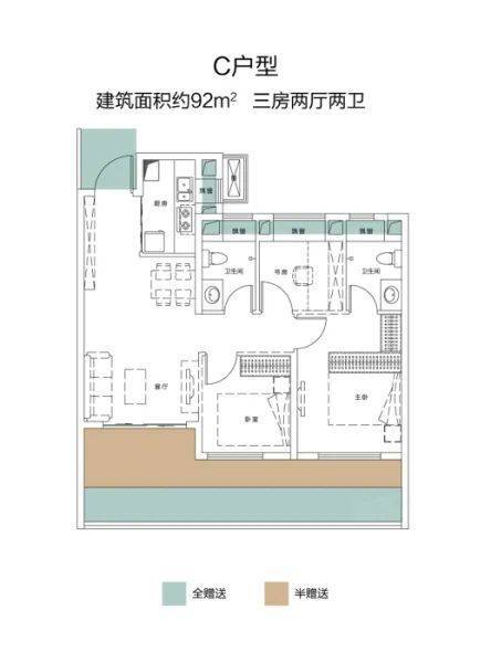 这个建面约92㎡的户型,虽是入门级户型,却是板块内唯一的百平以下双卫设计。