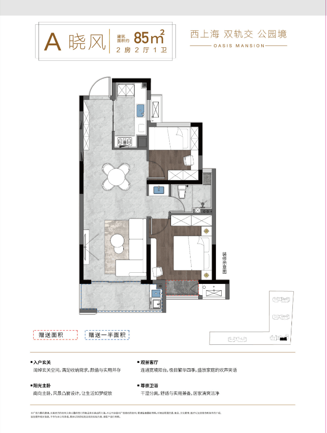 :如85平方米的2室2厅1卫户型,适合小家庭或年轻夫妇居住。