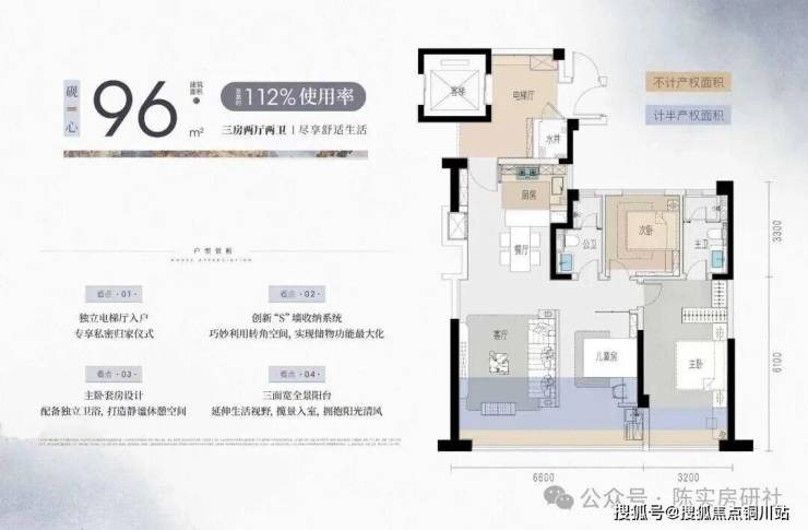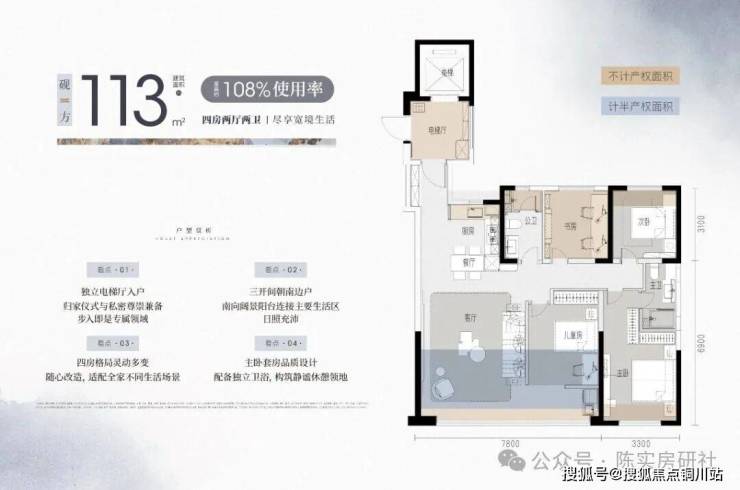 该项目建面段为约96㎡-113㎡,户型负公摊,户户独梯入户,96㎡实得107㎡ 得房率112%,113㎡实得122㎡,边户4房,得房率108%。户型图如下