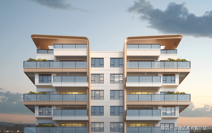 另外,标志性香槟色铝板线条勾勒出极具标志性屋檐设计,“展翅飞翔”造型挑檐给予归家尊崇体验。搭配大玻璃栏板,增强空间的通透感和自然采光,视觉非常震撼!