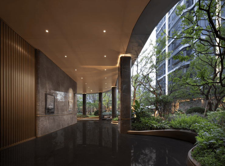 挑高4.5米的风雨连廊也在成为归家的一部分,不仅串联着楼体,项目整体园区也因为这个元素被完整串联在一起