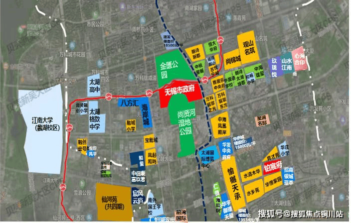 自市政府搬到经开区以来,金融街也如火如荼地建造,现在无锡商政两大聚集地都在经开区的尚贤河湿地公园旁,"尚贤河"也是求才若渴之意,河流直通南向太湖,引财入府。