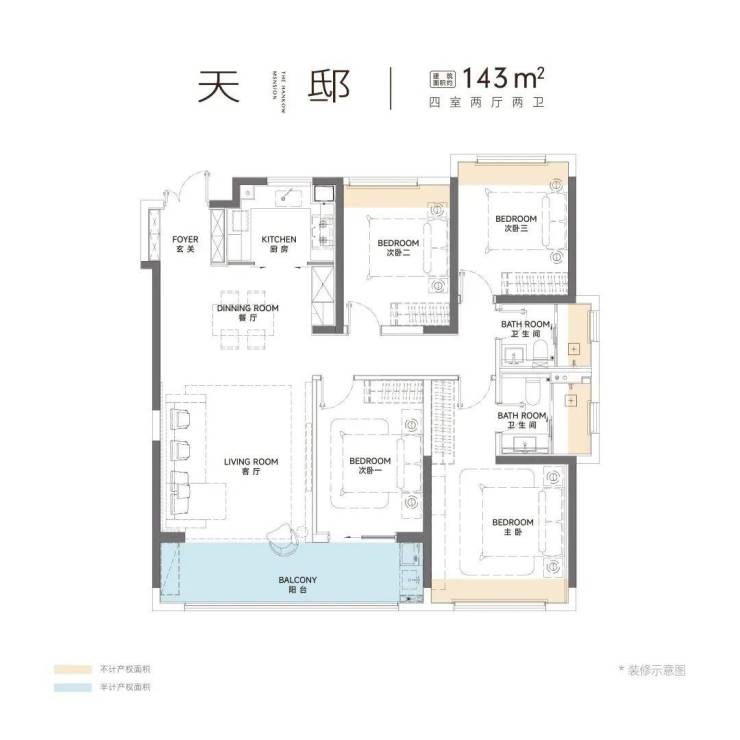 建面约143㎡四房则将空间优势发挥到极致,约11米南向面宽搭配三面采光的全明格局,让阳光成为日常标配。约7米贯通式观景阳台既是晾晒区,更是俯瞰城市的"空中观景台"。