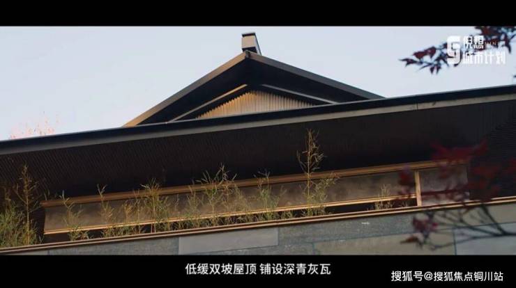 低缓双坡屋顶,铺设深青灰瓦;延展遮阴的屋檐,采用香槟金色金属线条收边;大面落地窗融于干挂石材的墙面。建筑的形制、色彩、材料、比例,尽显宋式顶级简约审美的风骨。