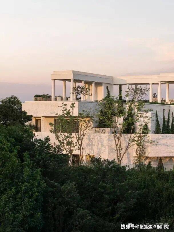 1. 色调纯净,度假美学:立面以浅暖米黄石材为底,点缀金属、玻璃,焕新法式奢华艺术气质。罗马柱与宝瓶柱阵列、隽永雕花,凝练地中海浪漫神韵,恢宏典雅。
