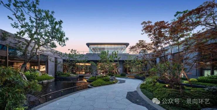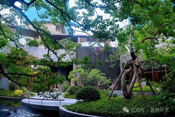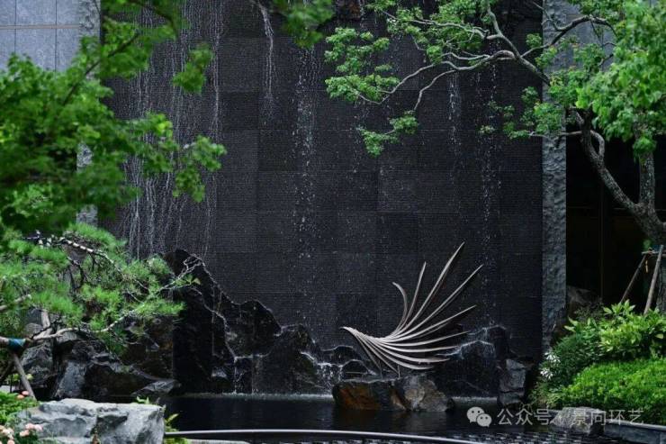 · 飞瀑流泉,由珍宝奢石流瀑形成震撼的记忆点,乌桕、原石、潭水、瀑布等辉映成趣,以艺术创想交融自然诗意与视觉盛宴。