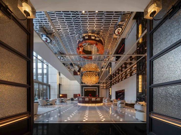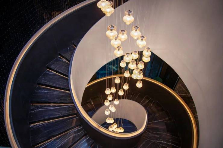 大堂以星级高奢酒店为蓝本,甄选全球奢材,蓝翡翠奢石优雅而奢华,劳伦黑金大理石神秘高贵。大堂采用世界上古老的水晶玻璃品牌Barovier&Toso凤羽水晶灯,像LV、宝格丽酒店、北京银泰中心卡地亚旗舰店都能看到Barovier&Toso的身影。