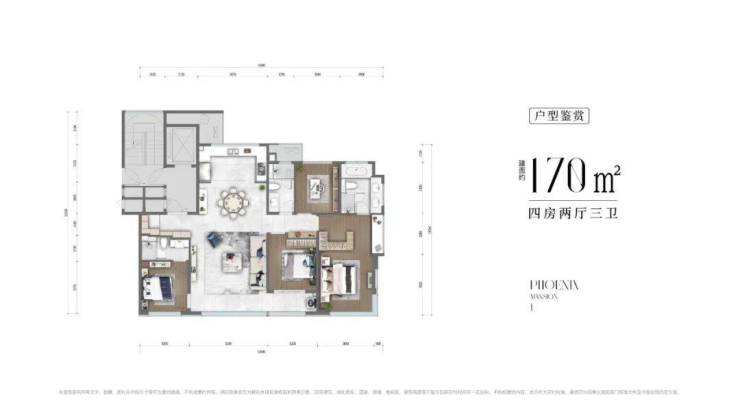 建面约170㎡四室两厅三卫户型,南向近5.1m的宽厅设计,搭配南向双阳台,阳台足有8.35米的宽度,给人带来宽景瞰山视野,这种尺度常见于市场190㎡户型产品 。