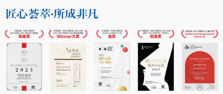 凭借中国铁建扎实的匠造功底、独树一帜的产品营造以及二环湖岛的珍贵资源,项目也获得了市场热烈的回应:在楼市深度调整的新周期里,中国铁建·花语汀澜走出了高去化的独立行情,成为区域乃至武汉家喻户晓的口碑红盘;2024年9月底遇上“稳楼市”等系列政策颁布,武汉楼市在9月底至十一国庆期间迎来爆发期,花语汀澜项目在国庆期间累计销售排名武汉前三名。在国内外竞技舞台上,项目更是屡屡获得专业大奖,将极具含金量的“美国MUSE室内设计类最高奖——铂金奖”、“美国TITAN住宅类铂金奖”、 “IAA 伦敦设计大奖金奖”、“西班牙AMA国际建筑设计大奖”等十项大奖收入囊中。
